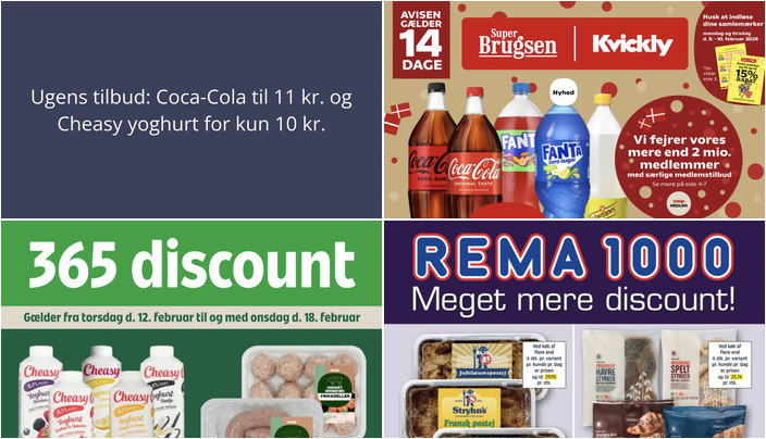 SuperBrugsen tilbyder denne uge Coca-Cola, Fanta eller Schweppes i flere varianter til kun 11 kr. pr. flaske (125-150 cl). Bemærk, at der er tale om et begrænset parti. Tilbuddet gælder fra fredag d. 6. februar til torsdag d. 19. februar 2026.